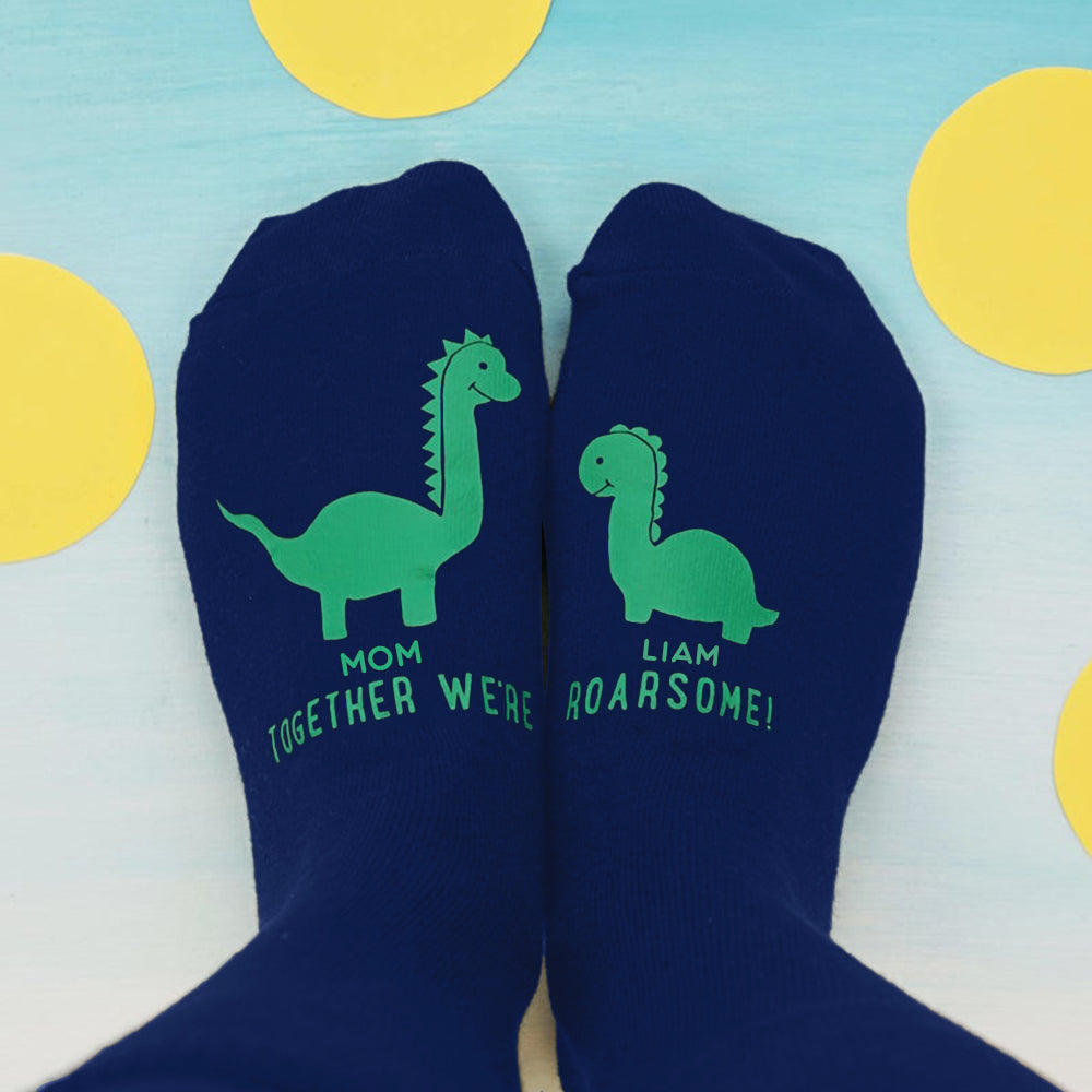Our Personalized Mummy Dinosaur Socks make the perfect gift for Mom. They are perfect for dinosaur lovers.