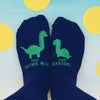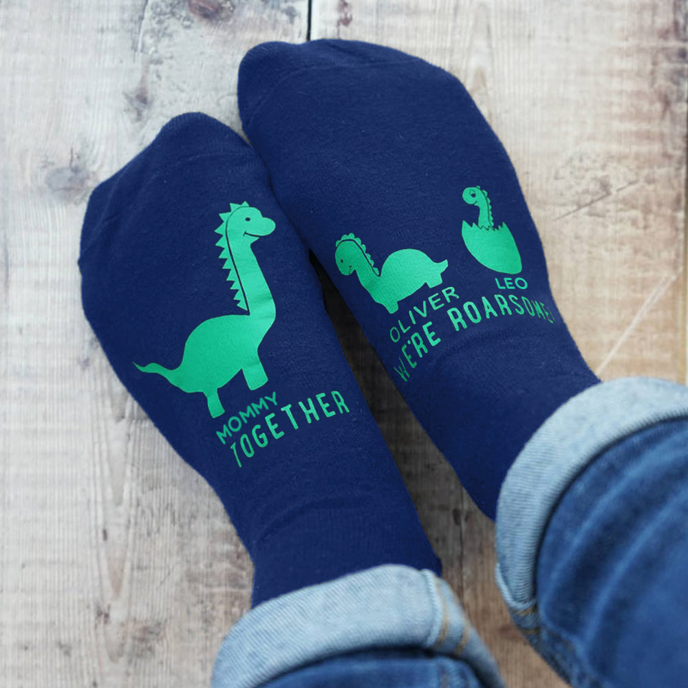 The socks feature our cute hand drawn dinosaurs, A Mummy dinosaur and you can add up to three baby dinosaurs and a baby dinosaur in an egg too. They can be personalized with any names you choose, for example, 'Mummy', 'Liam' and 'Oliver'.