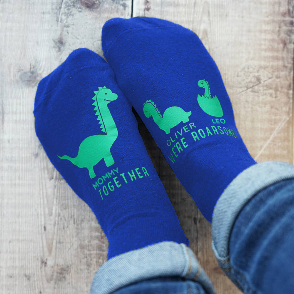 The socks feature our cute hand drawn dinosaurs, A Mummy dinosaur and you can add up to three baby dinosaurs and a baby dinosaur in an egg too. They can be personalized with any names you choose, for example, 'Mummy', 'Liam' and 'Oliver'.
