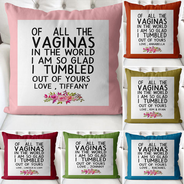 Funny Custom Name Pillow Case – Of All the Vaginas in The World I am So Glad I Tumbled Out of Yours